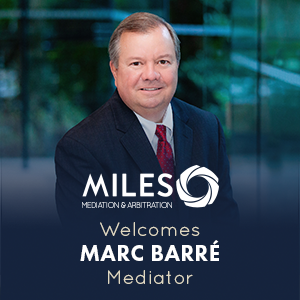 “For some time, we’ve been expanding our capacity to service clients who handle large and complex matters,” said John Miles, CEO of Miles Mediation & Arbitration. “Marc Barré is an experienced and respected litigator who can expertly mediate these types of cases. I’m pleased he decided to join our team.”